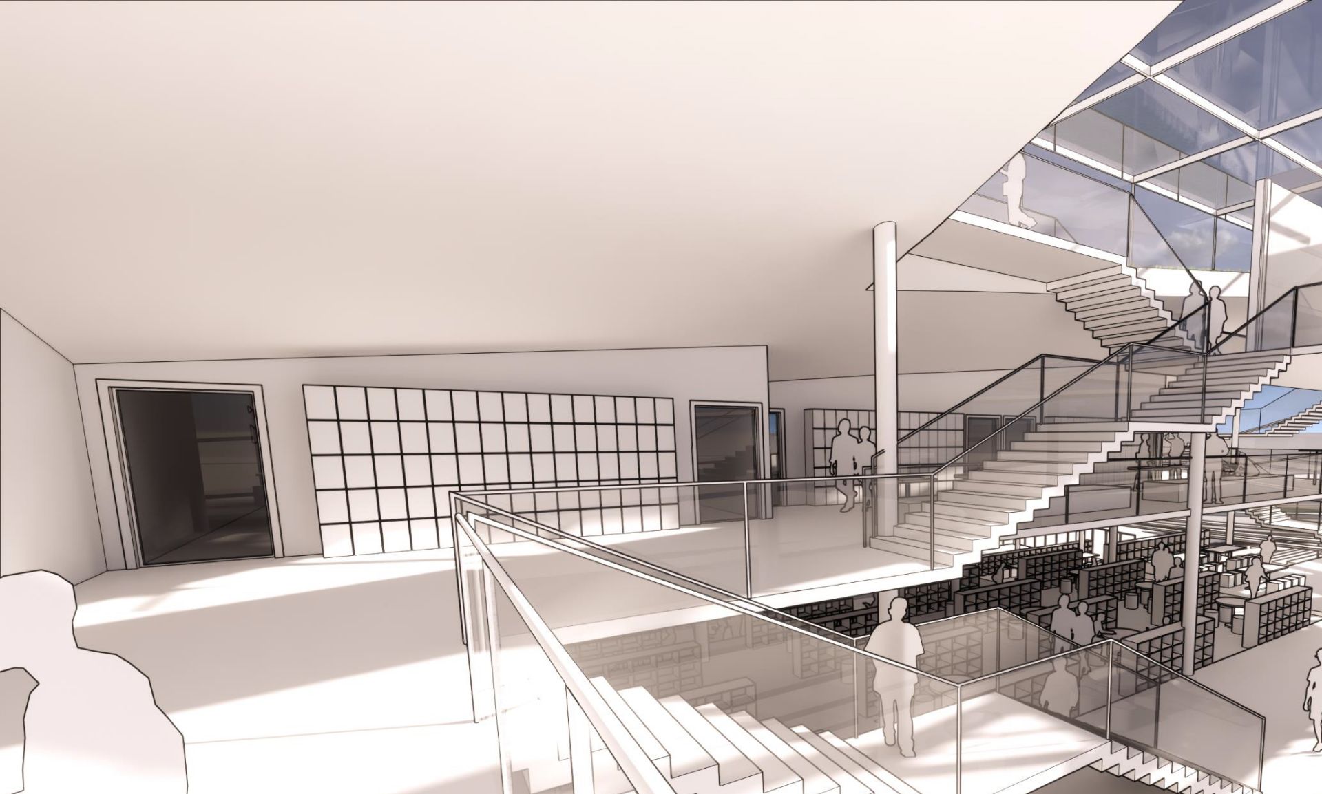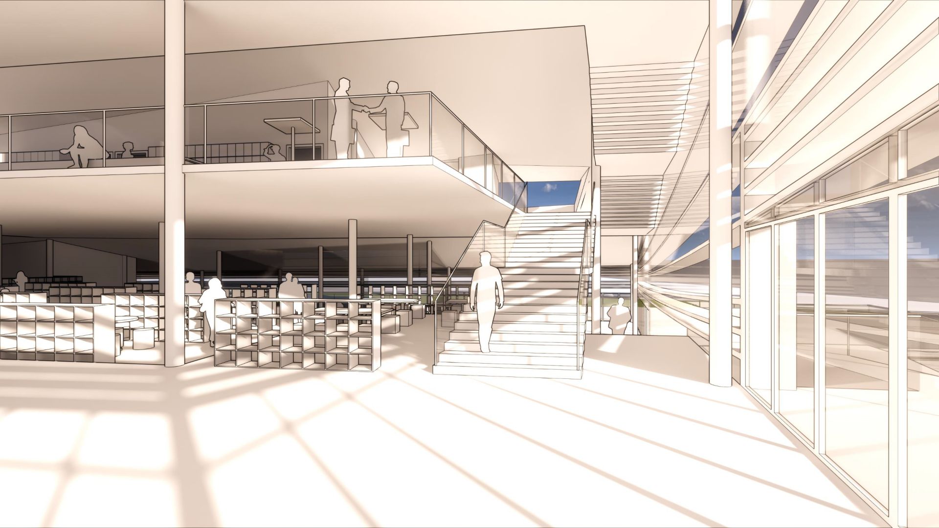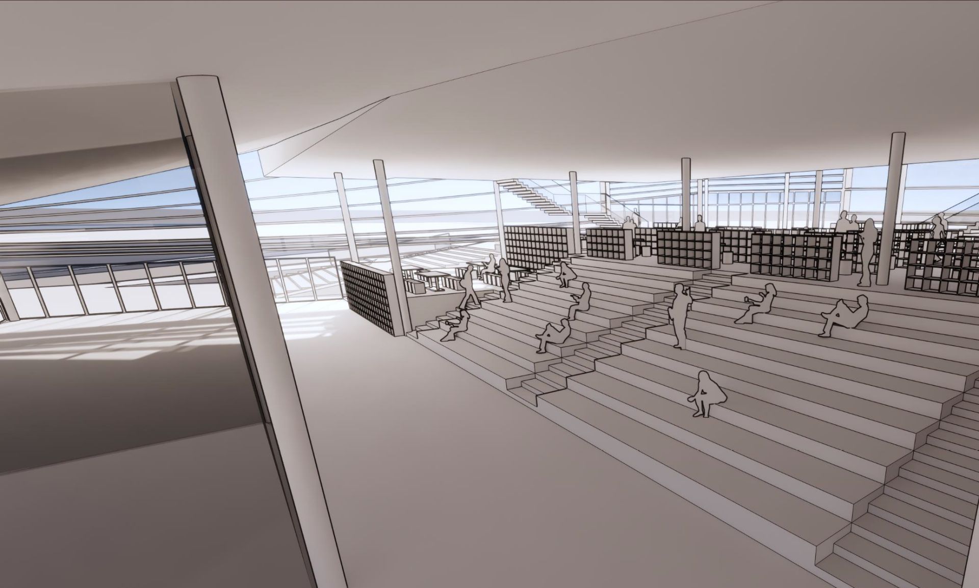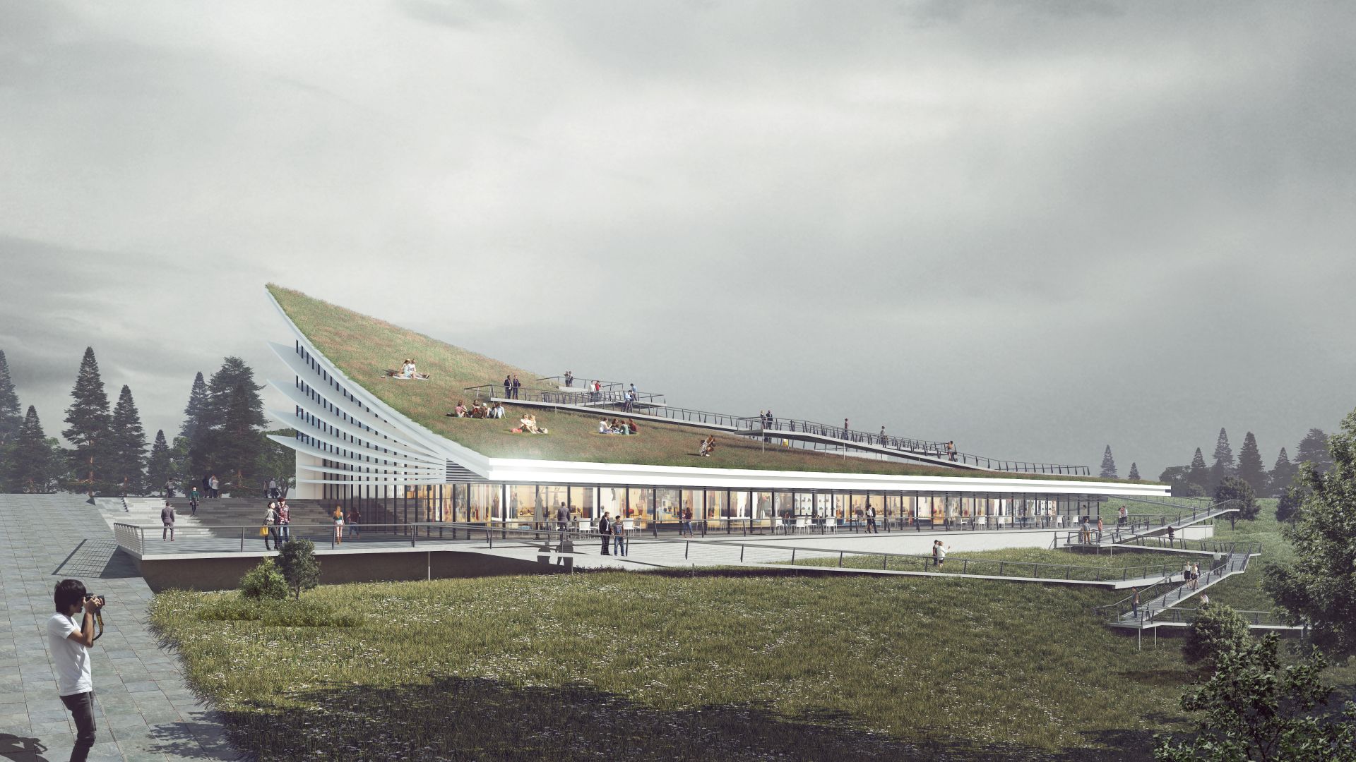这是一个临湖的景观建筑,我们以“书山有路”的概念将视线焦点从湖面一直引到山上的建筑,回应城市发展的文化归属,同时也是顺应山水之势的熨帖表达。